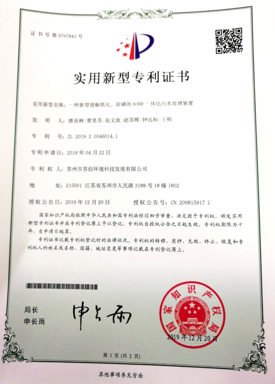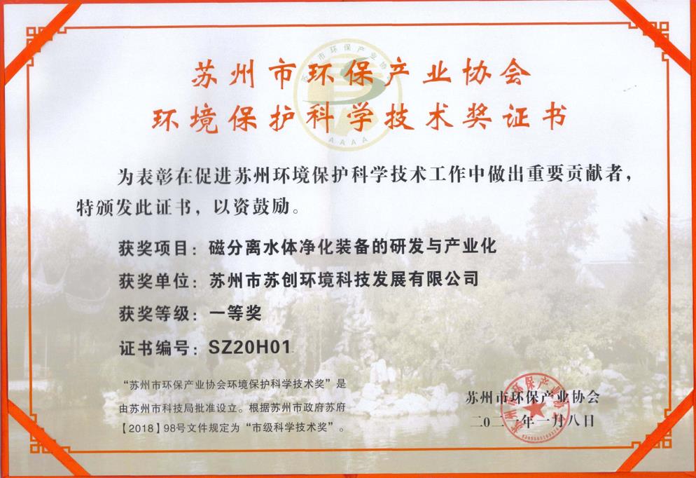 磁分離+反硝化+曝氣生物濾池一體化裝備 采用磁沉淀和曝氣生物濾池相結(jié)合的水體凈化工藝蘇創(chuàng)環(huán)境 · 專利與榮譽(yù)成果